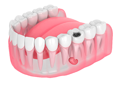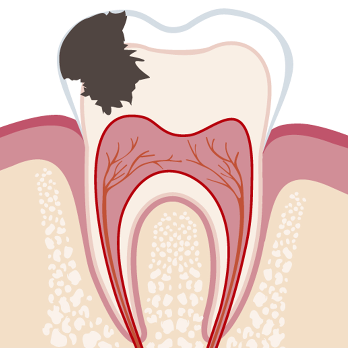 What happens if caries is left untreated? Without treatment, the inflammation reaches the pulp and dental nerve, causing severe pain. In severe cases, the inflammation can affect the bone (periostitis) and the surrounding bone roots (periodontitis). All of this can lead to complete tooth decay.